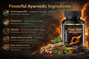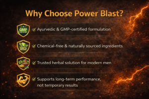 Power Blast Capsules are a powerful Ayurvedic formula crafted for men who want more stamina, better control, and renewed confidence. Enriched with time-tested herbs like Ashwagandha, Shatavari, Shilajit, and other natural ingredients, Power Blast works from within to support long-lasting performance and overall male vitality.